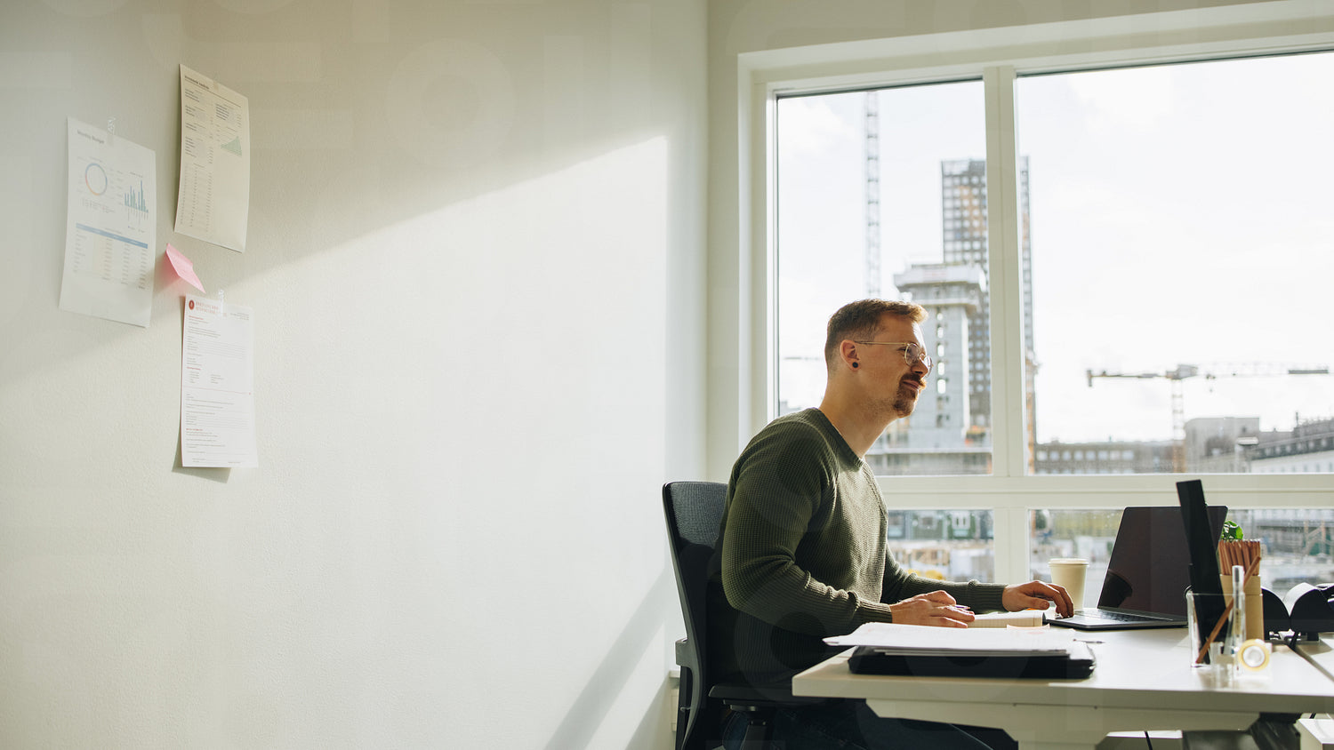 Businessman working at desk in office. Manager looking away and thinking while at work.