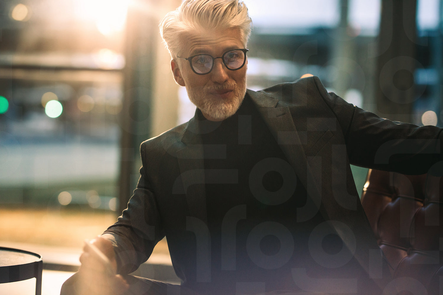 Portrait of handsome mature businessman sitting indoors in office. Man in formal clothes sitting on office lobby.