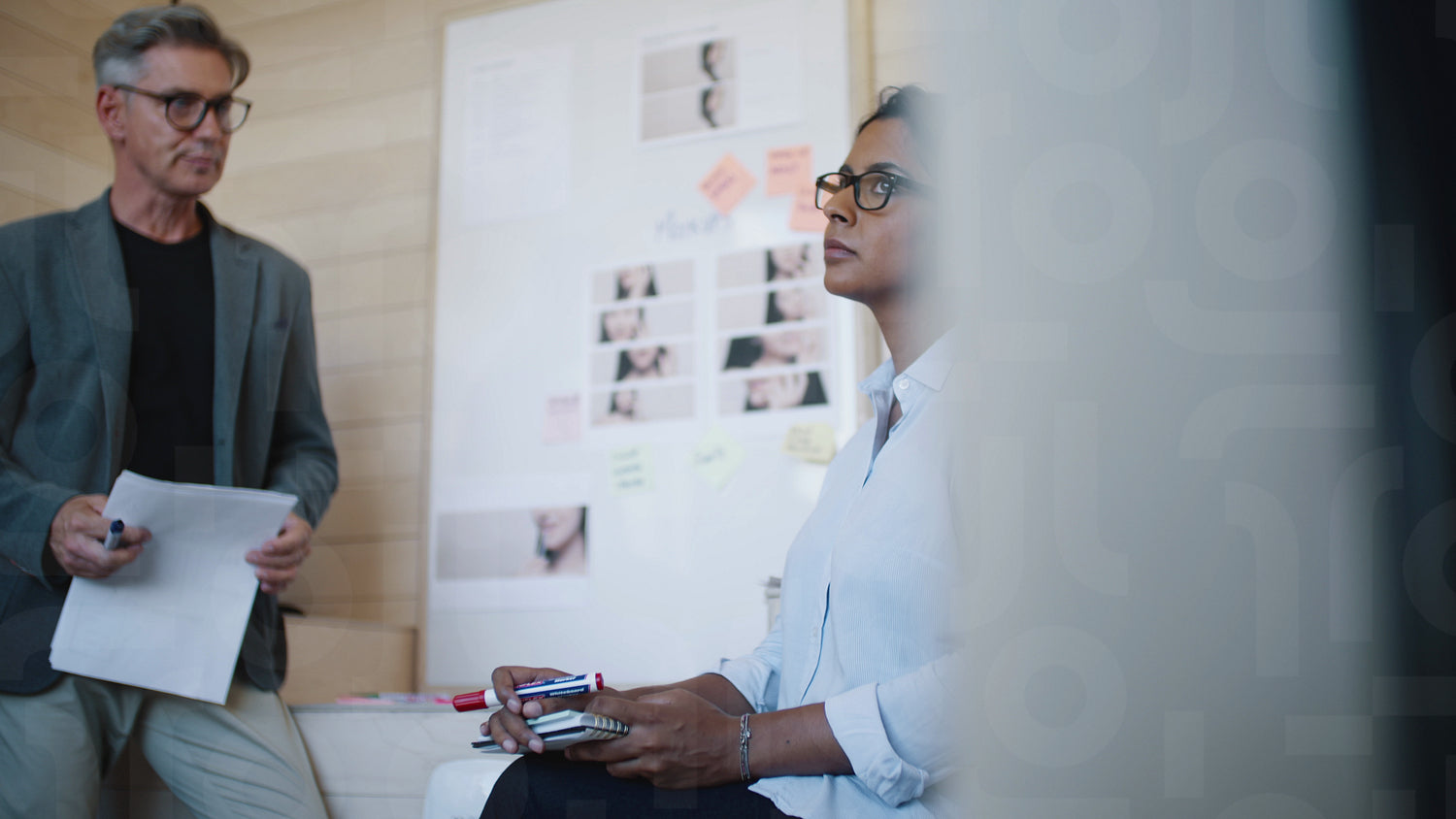 Business colleagues brainstorming together in a modern office. Two business partners having a discussion in office over a new project.