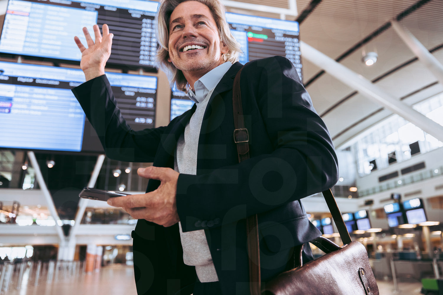 Businessman waving away while at international airport. Business traveler at airport terminal.