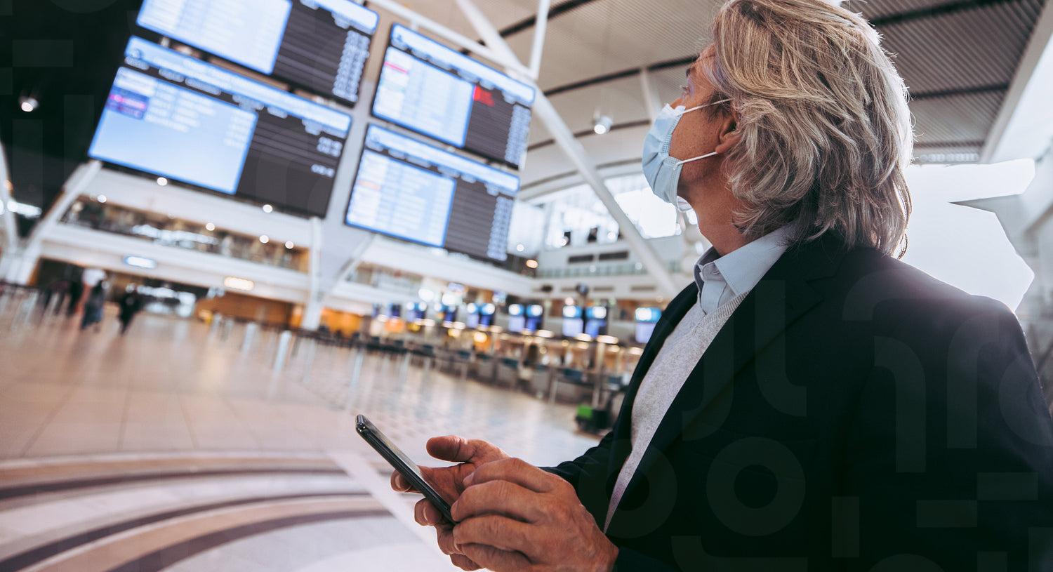 Businessman wearing face mask looking at arrival departure board in airport terminal. Male traveler looking at flight Information screen in the airport during pandemic.