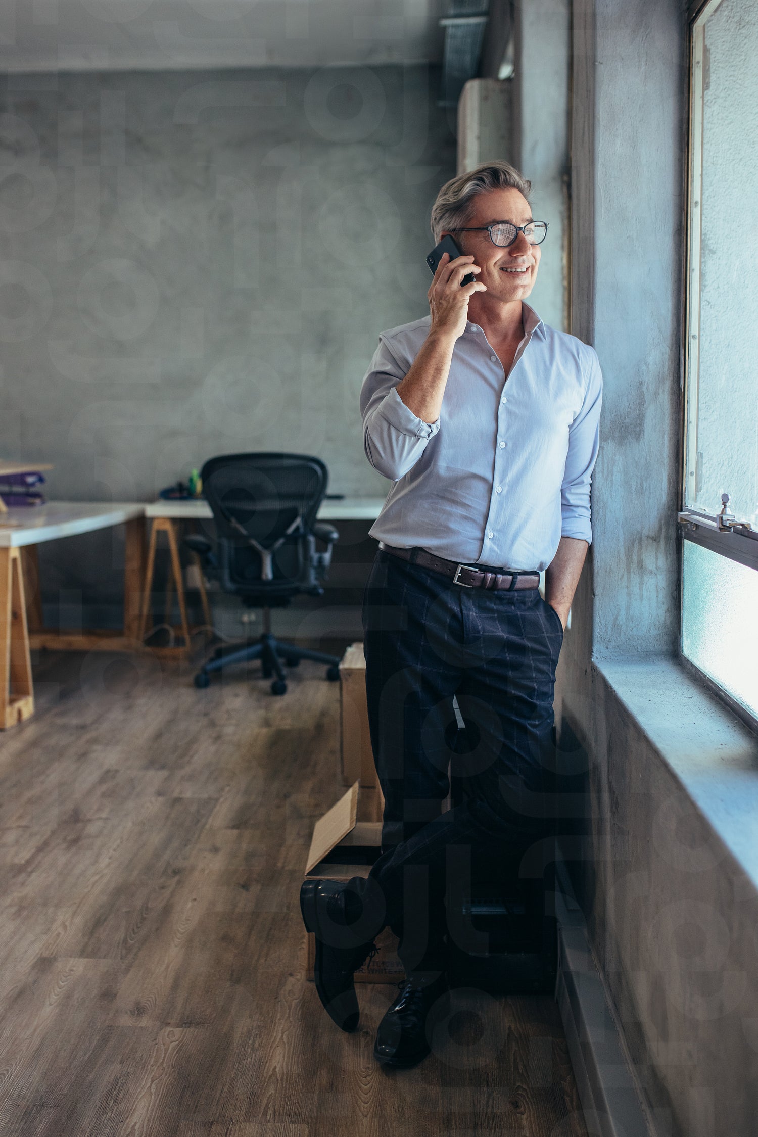 Full length shot of mature businessman talking on phone. Man standing by office window making a phone call.