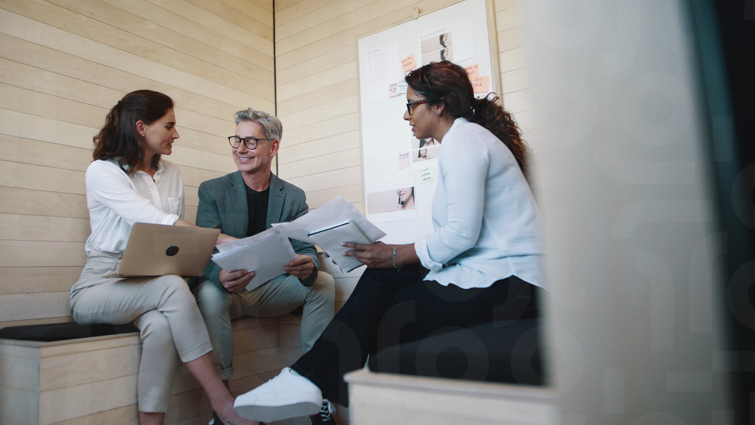 Businesspeople having a brainstorming over new marketing strategies together in a modern office. Group of business professional having a discussion in office over a new project.