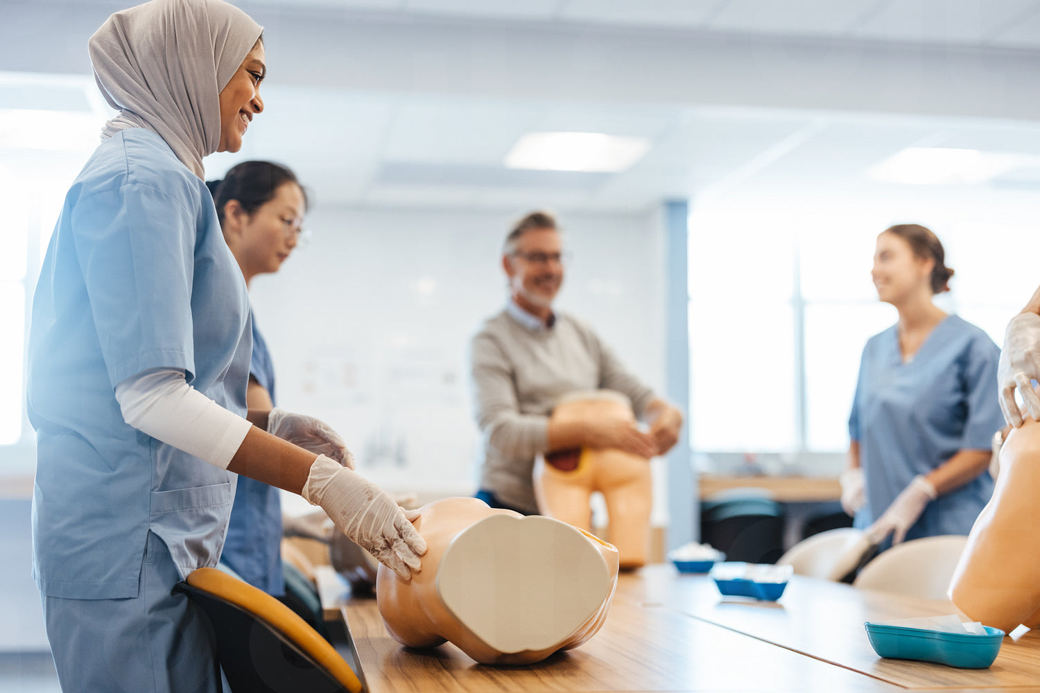 Group of multicultural medical students, dressed in scrubs, learn a practical lesson on human anatomy using medical manquins. Young students