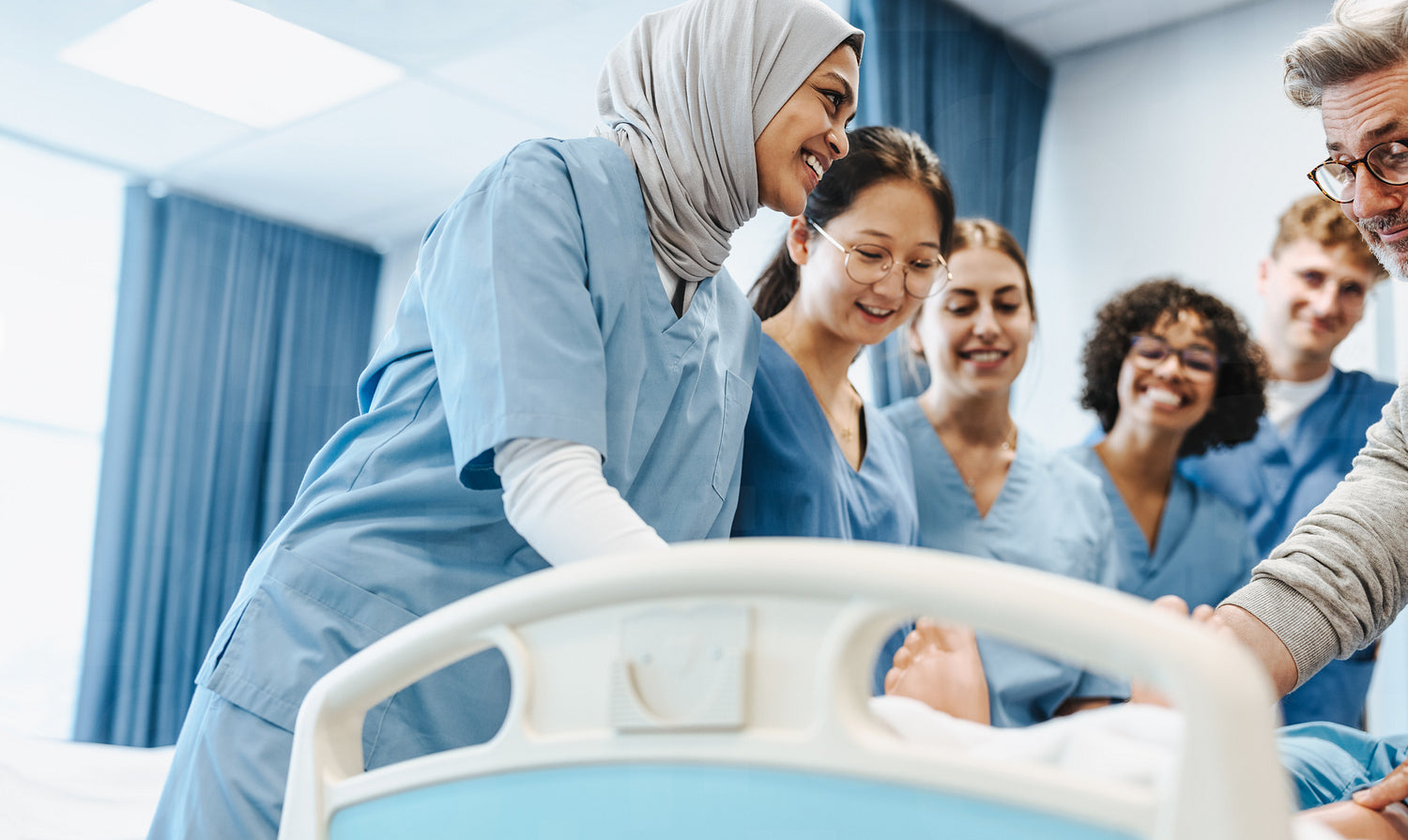 Happy medical students getting training and education from an experienced practitioner in a hospital. Group of young students learning and practicing with a patient simulator.