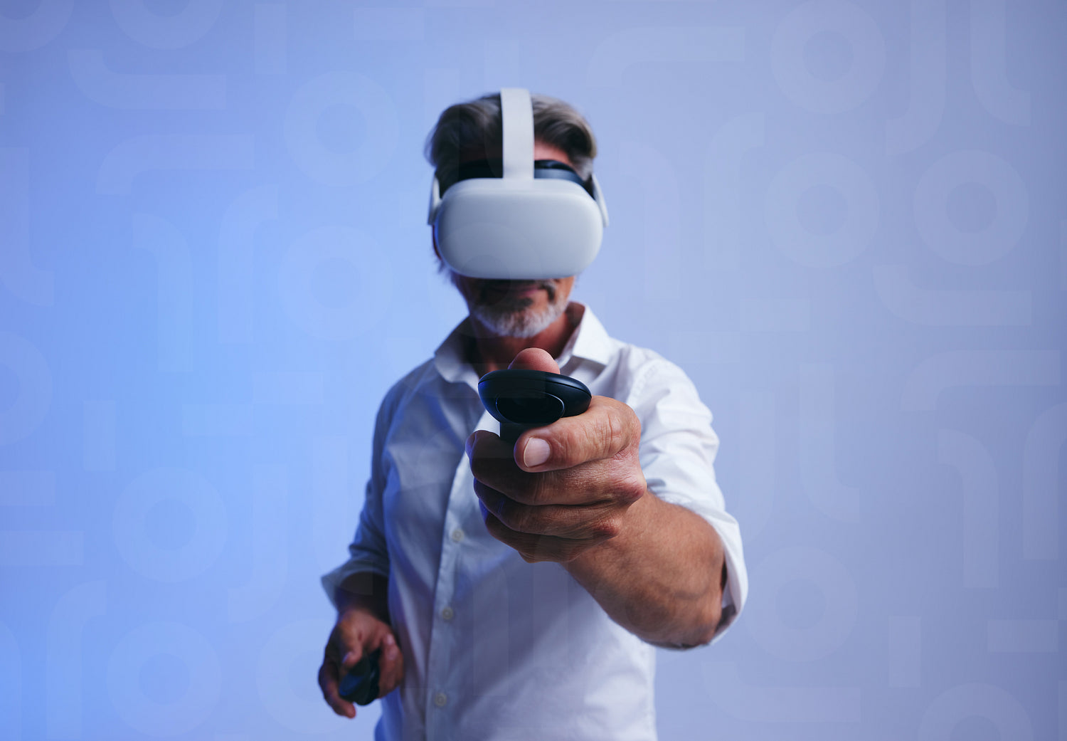 Getting business done in the metaverse. Senior businessman using a remote control to press a button in virtual space. Mature businessman wearing a virtual reality headset in a studio.