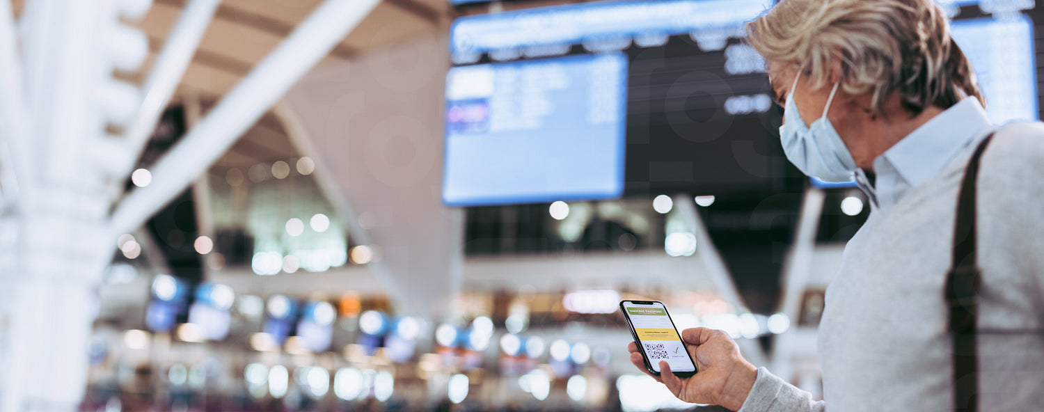 Man with digital vaccine passport on phone at airport. Passenger wearing face mask with digital certificate of covid-19 vaccination on phone display.