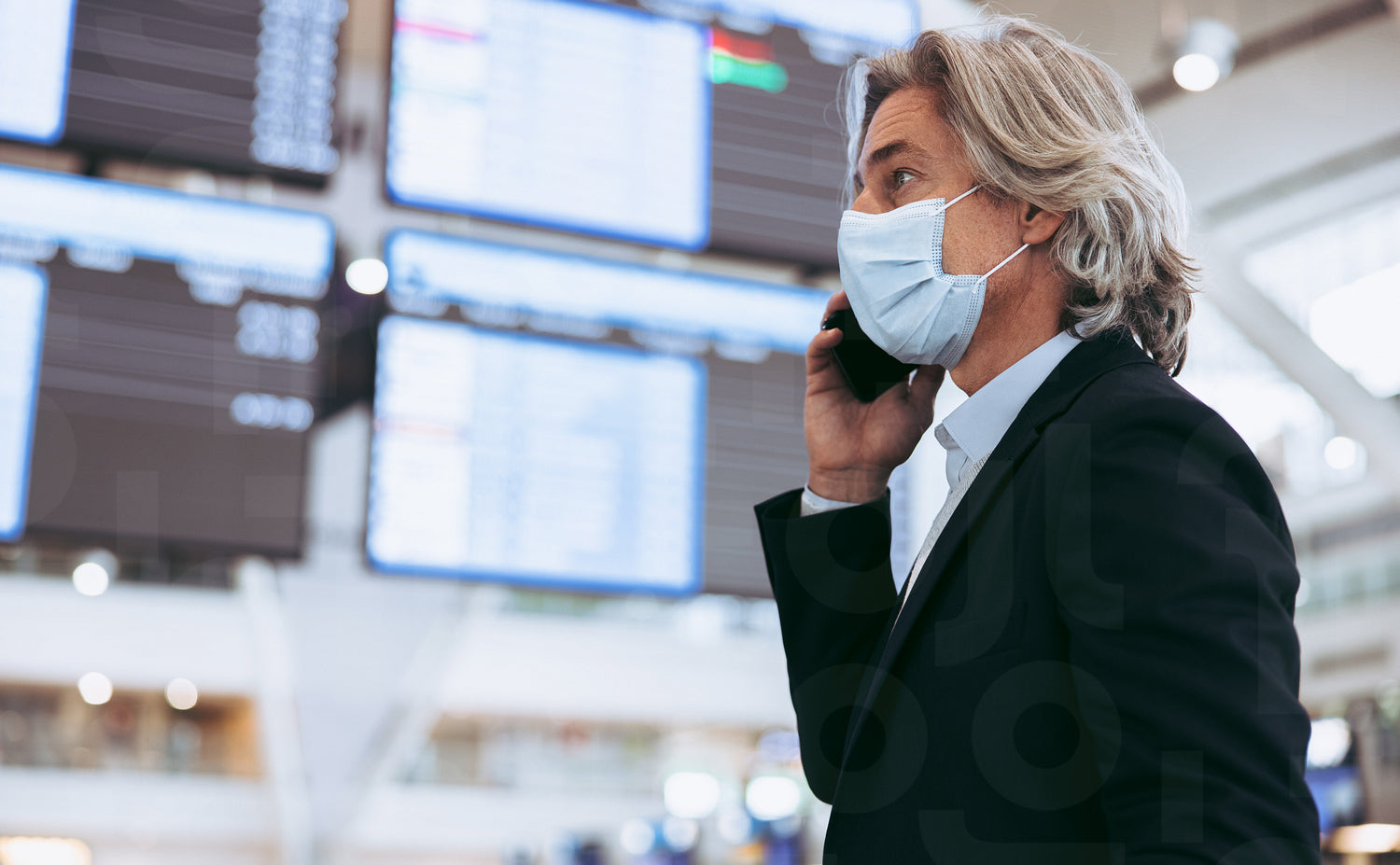 Man with protective face mask talking on cell phone while at airport. Mature businessman using phone at airport terminal. Air travel during covid-19 outbreak.