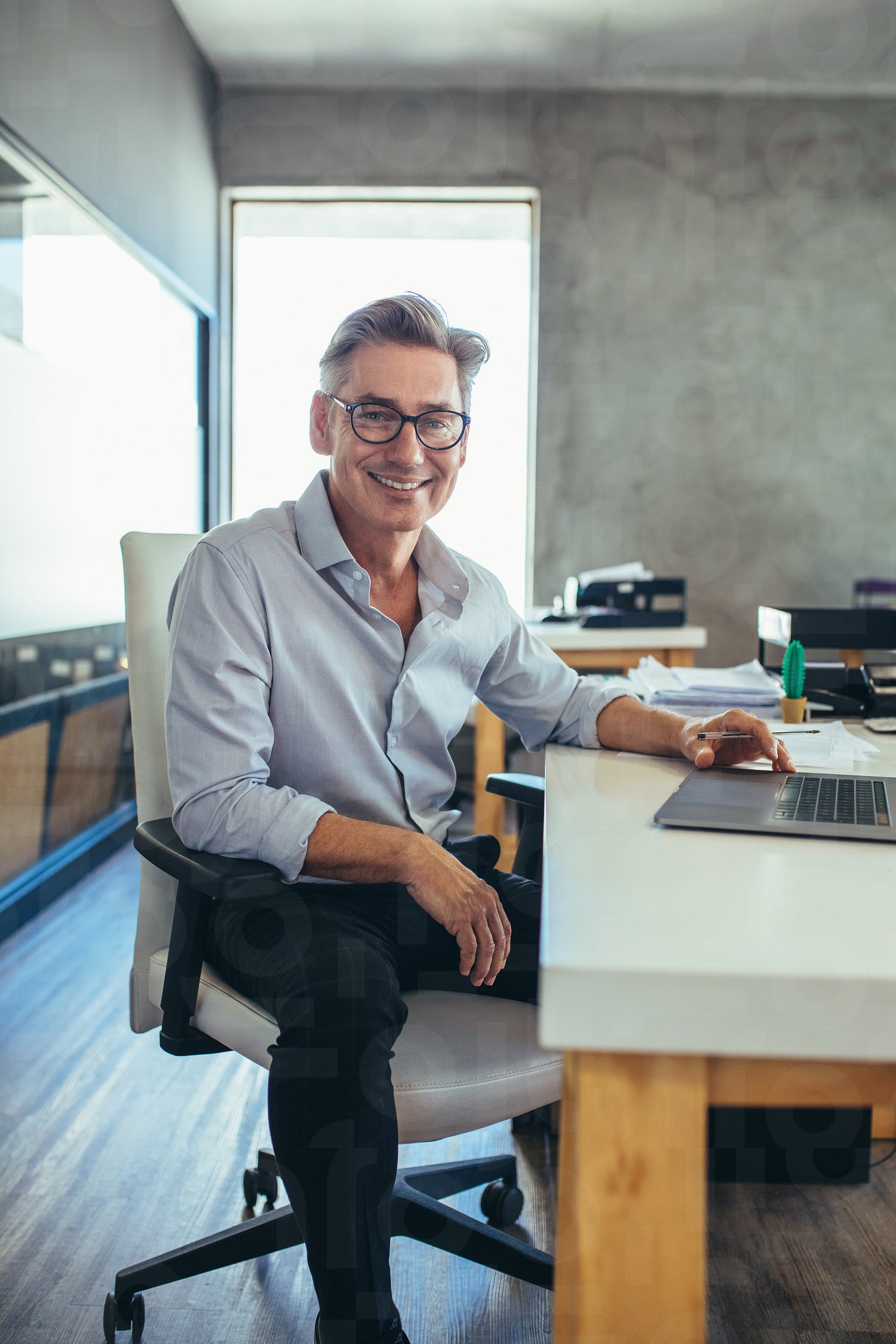 Male executive sitting at office desk and smiling. Mature businessman sitting at desk with laptop.