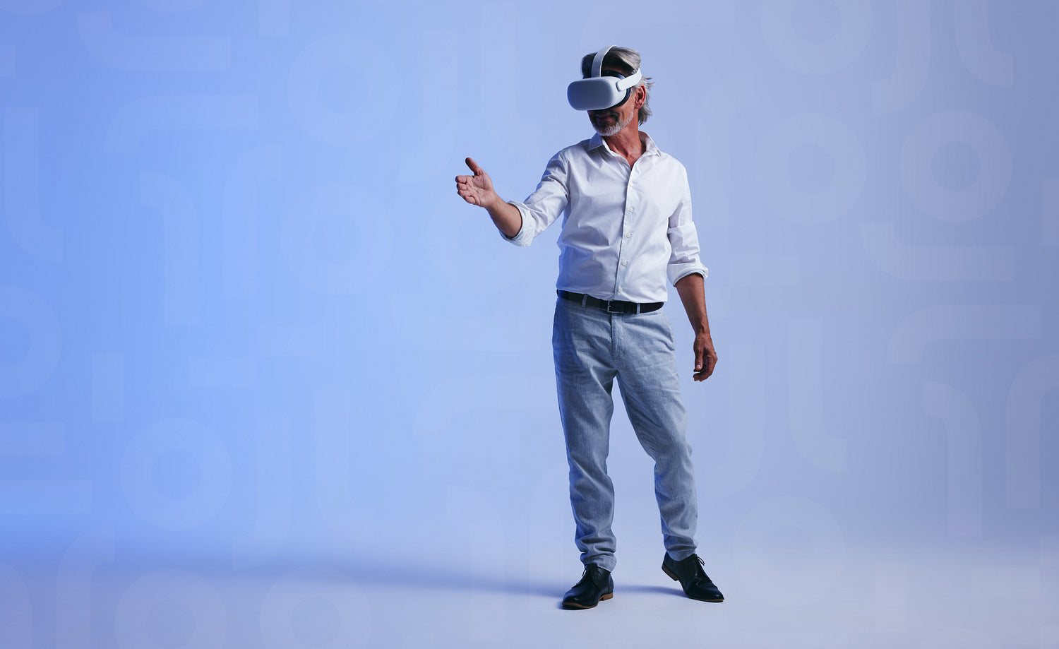 Mature businessman giving a virtual handshake in a studio. Senior businessman meeting a business partner in the metaverse. Cheerful businessman wearing a virtual reality headset.