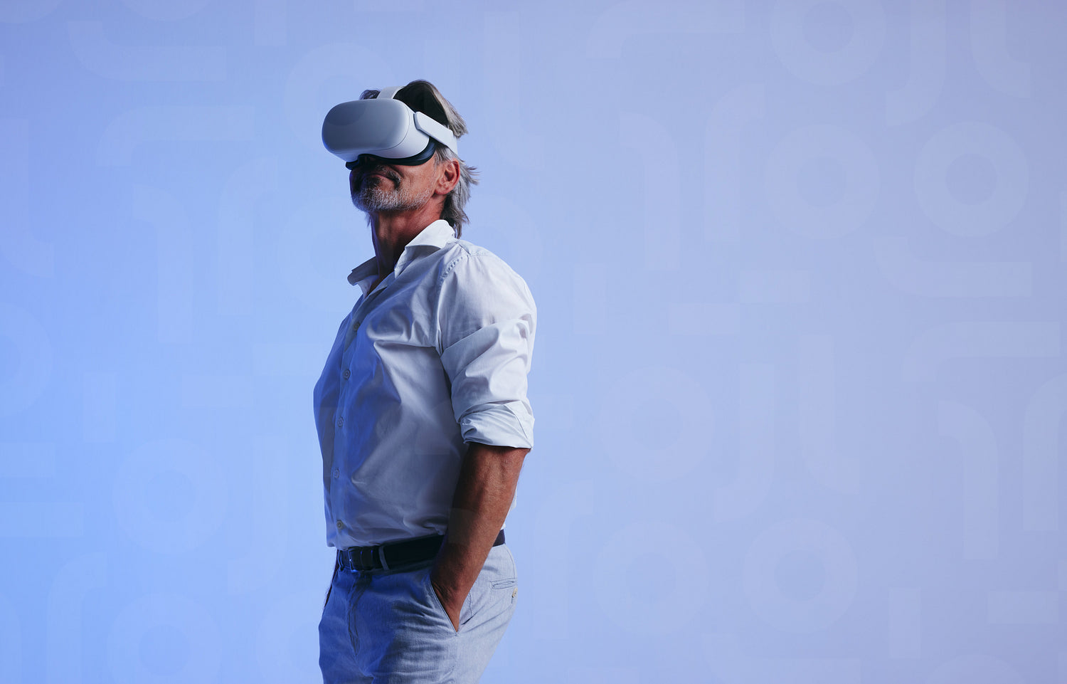 Senior businessman wearing a virtual reality headset in a studio. Mature businessman looking away while standing with his hands in his pockets. Businessman attending a virtual meeting in the metaverse.