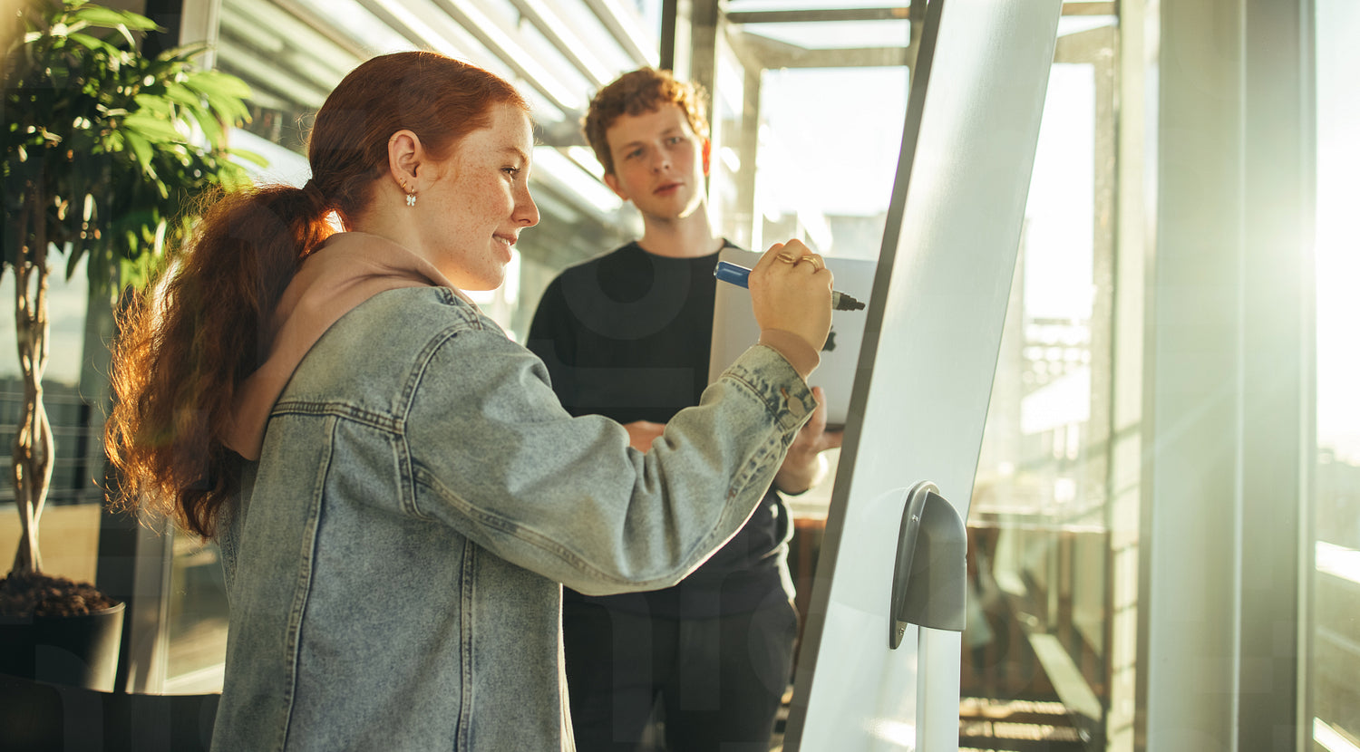 Female student writing an board in classroom with classmate in background. Student writing on board during class.