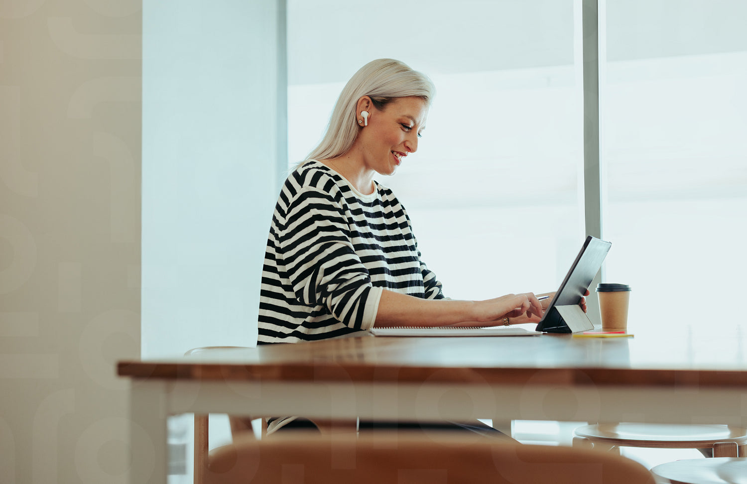 A female digital creator working on a tablet at a modern workspace. She is wearing a striped sweater and wireless earbuds, focused on her task, showcasing productivity in a contemporary setting.