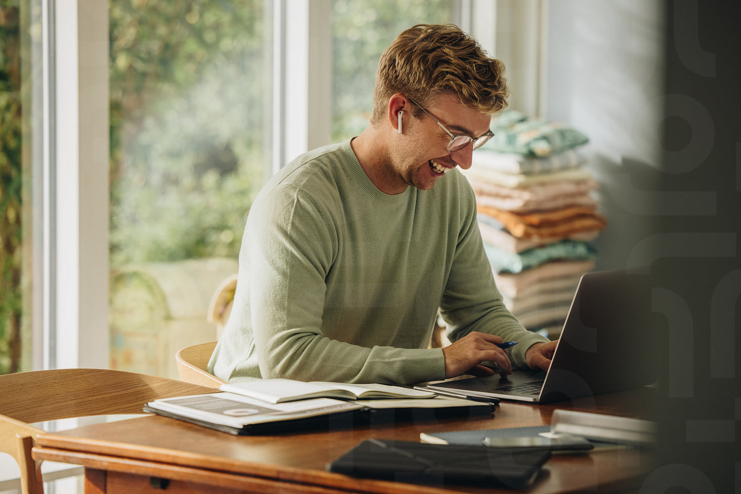 Smiling man working on laptop. Man staying at home using laptop and smiling.