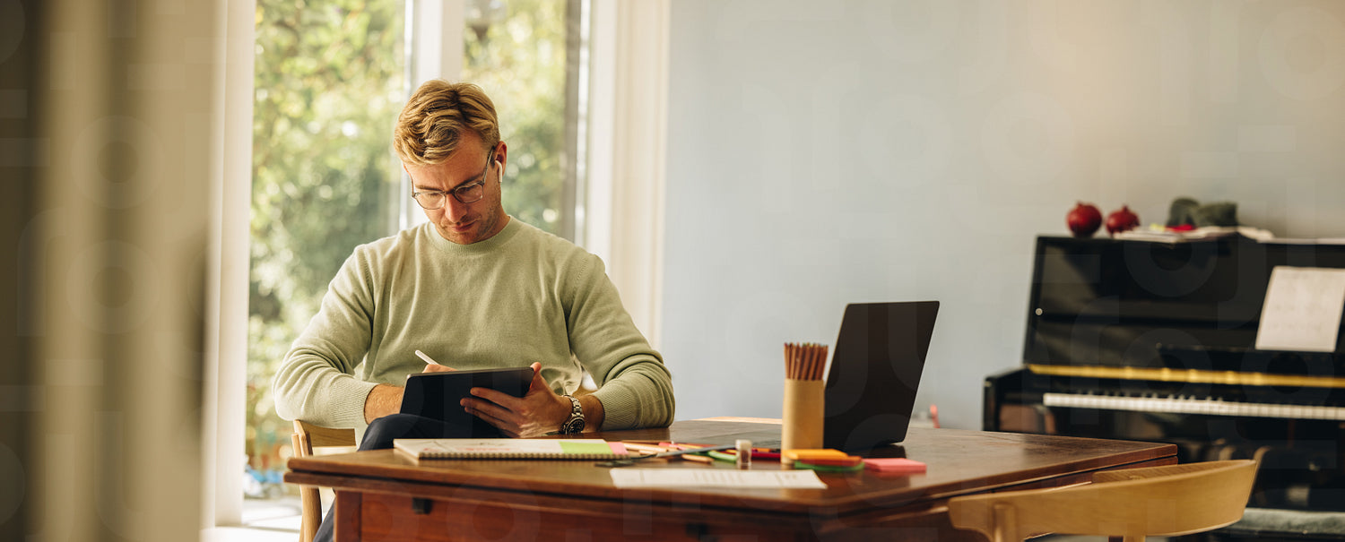 Male designer using graphic tablet and stylus pen. Artist illustrator drawing on tablet at home.