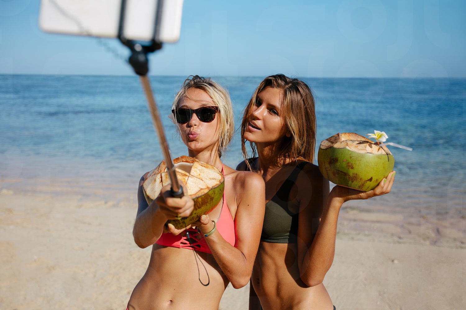 Two beautiful young women in bikini on the beach talking self portrait with smart phone on selfie stick. Female friends having fun on the beach with coconuts and taking pictures.