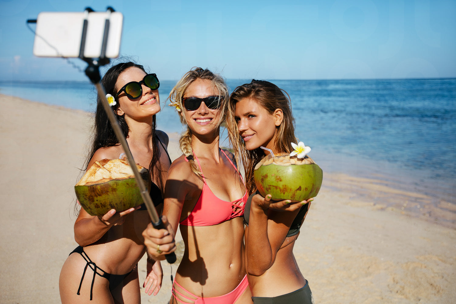 Group of young woman holding coconuts and taking selfie on the beach. Three young women in swimsuit on the beach taking self portrait with smart phone.