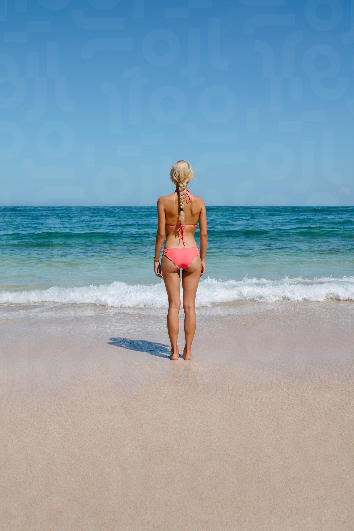 Rear view of sensuous woman wearing bikini at beach. Young female in swimsuit standing on the seashore and looking at the sea.