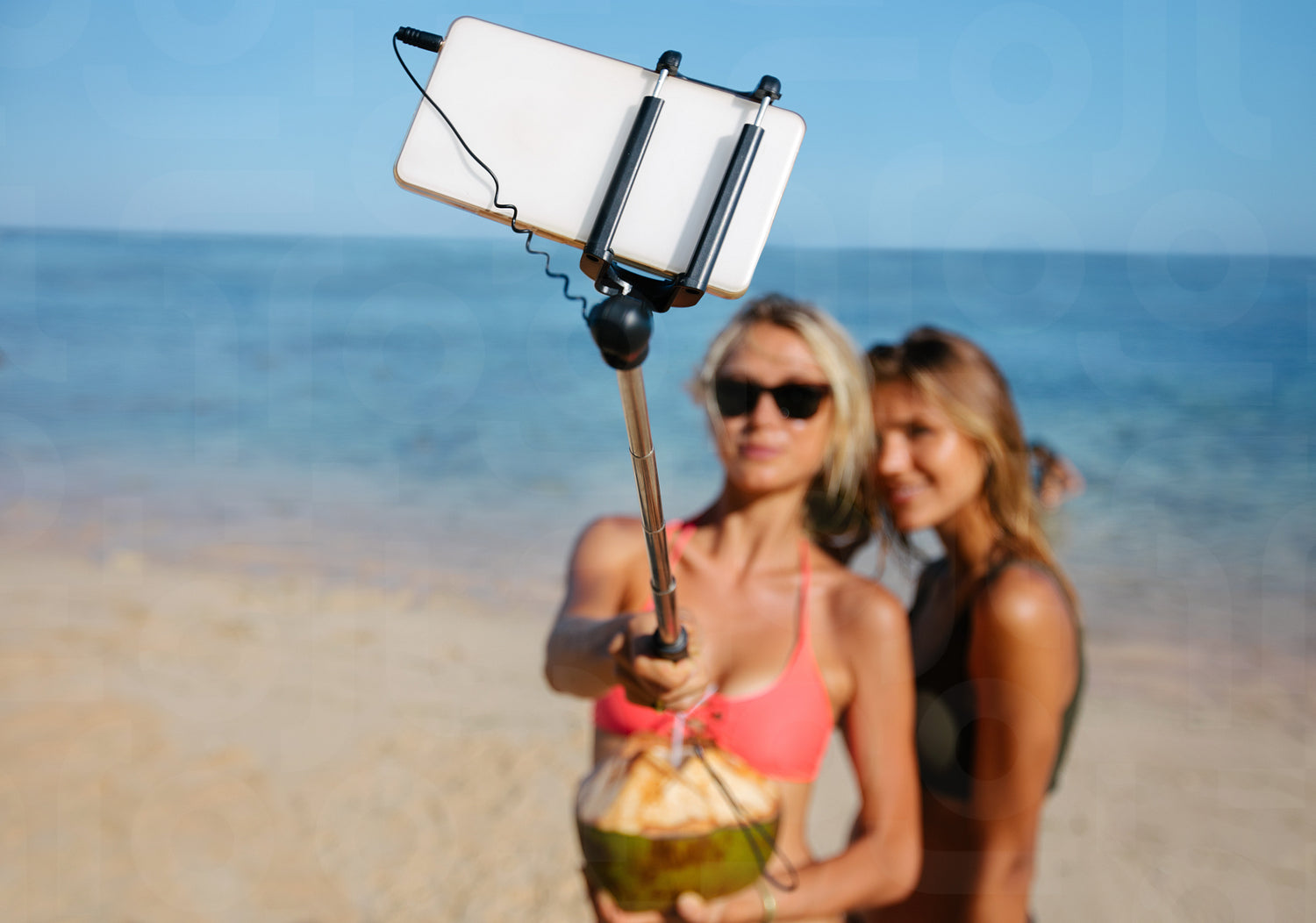 Two young female friends on the beach taking self portrait with mobile phone on selfie stick. Women on beach holiday taking selfie. Focus on smart phone attached to selfie stick.