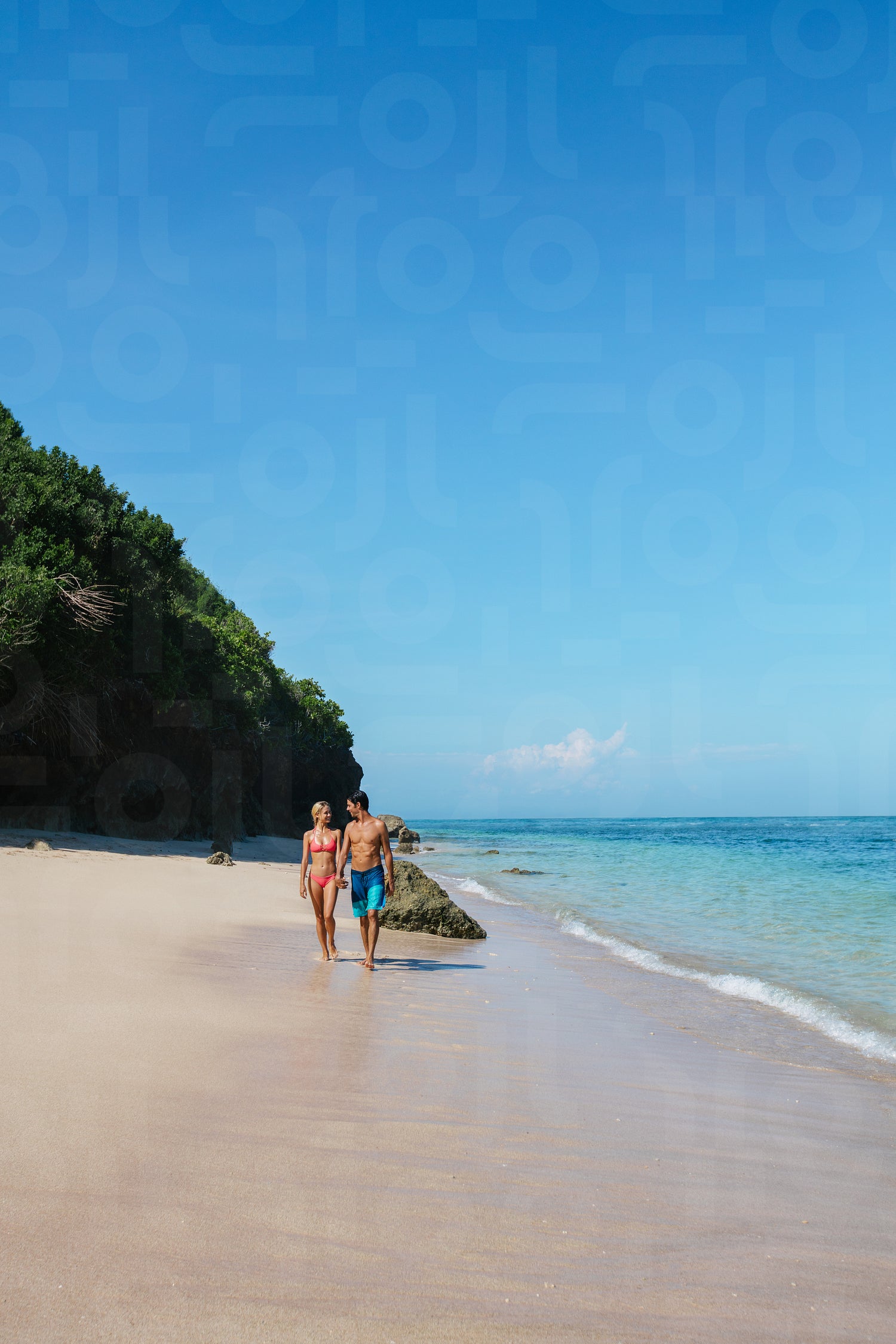 Shot of young man and woman walking on the tropical coast. Young couple strolling on the beach, enjoying summer vacation.