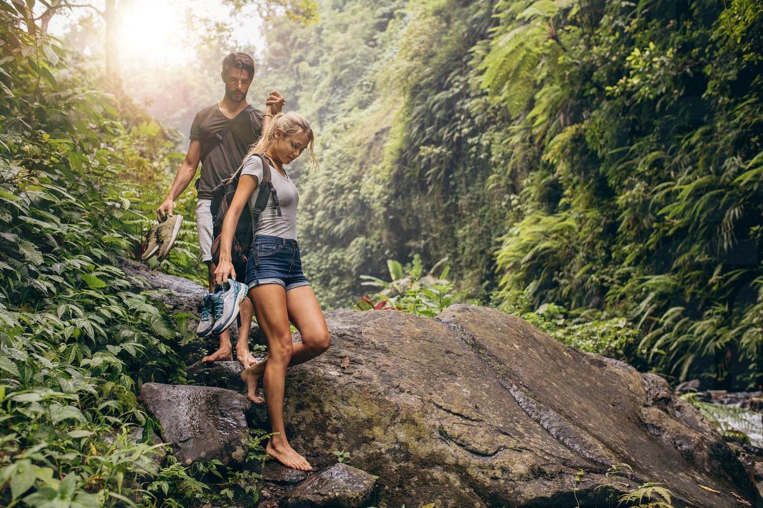 Shot of young couple walking through the mountain trail. Man and woman hiking on mountain trail barefoot.