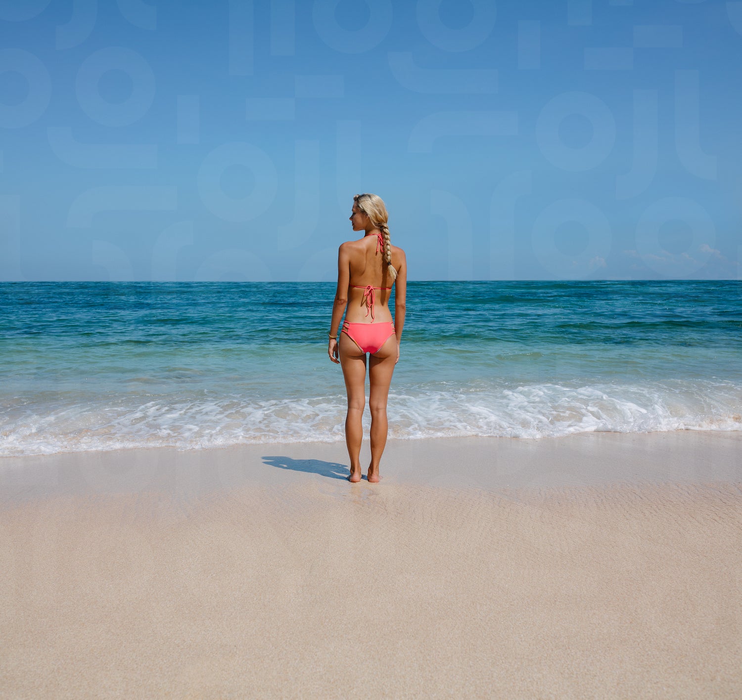 Rear view of beautiful young woman standing on serene beach. Caucasian female model in bikini on the seashore on summer day.