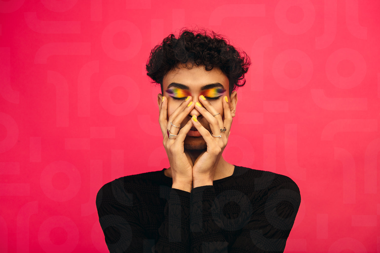 Gay man wearing rainbow colored eye shadow. Androgynous male holding his face with eyes closed on red background.