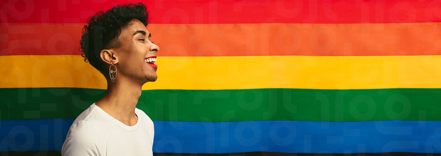 Profile view of gay man standing against pride flag and smiling. Banner of a transgender male wearing earring and makeup agasint a rainbow flag.