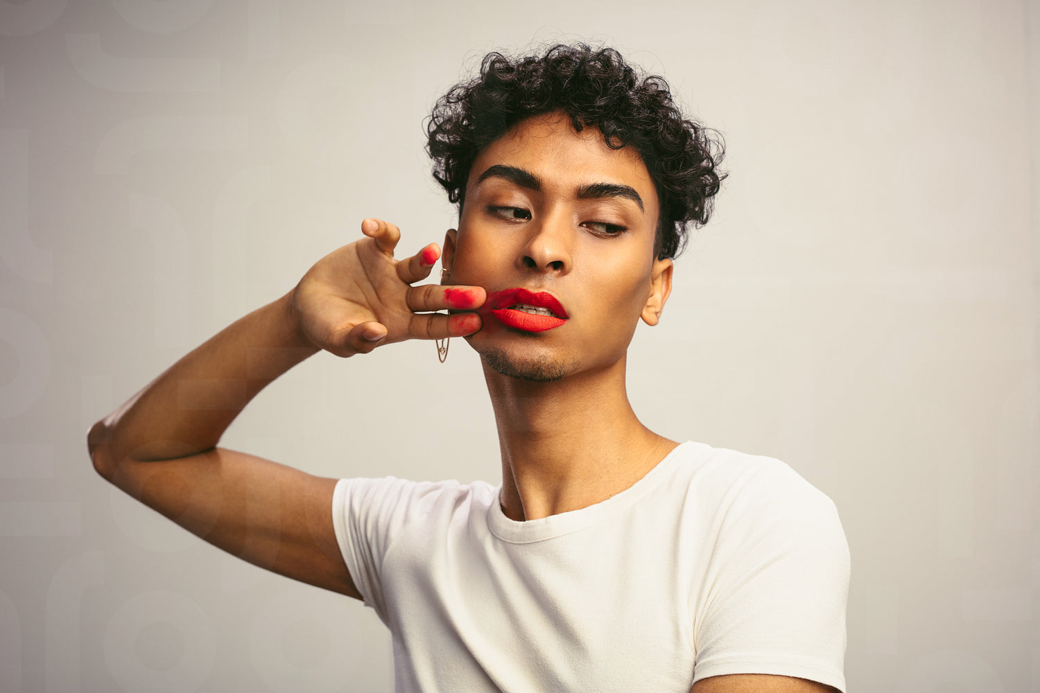 Transgender male smudging his lipstick. Young man smearing lipstick on his face against white background.