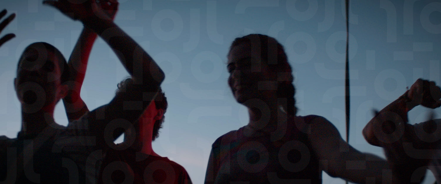 A group of friends are dancing and having fun at a concert. Captured using an anamorphic lens and presented in the 2.39:1 CinemaScope aspect ratio.