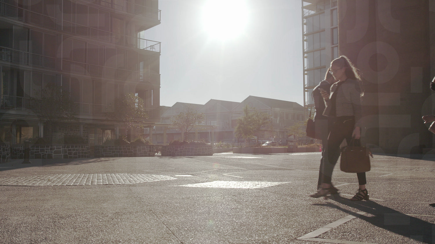 People commuting to office on a sunny morning. Business Men and women walking on city street with bright sunlight.