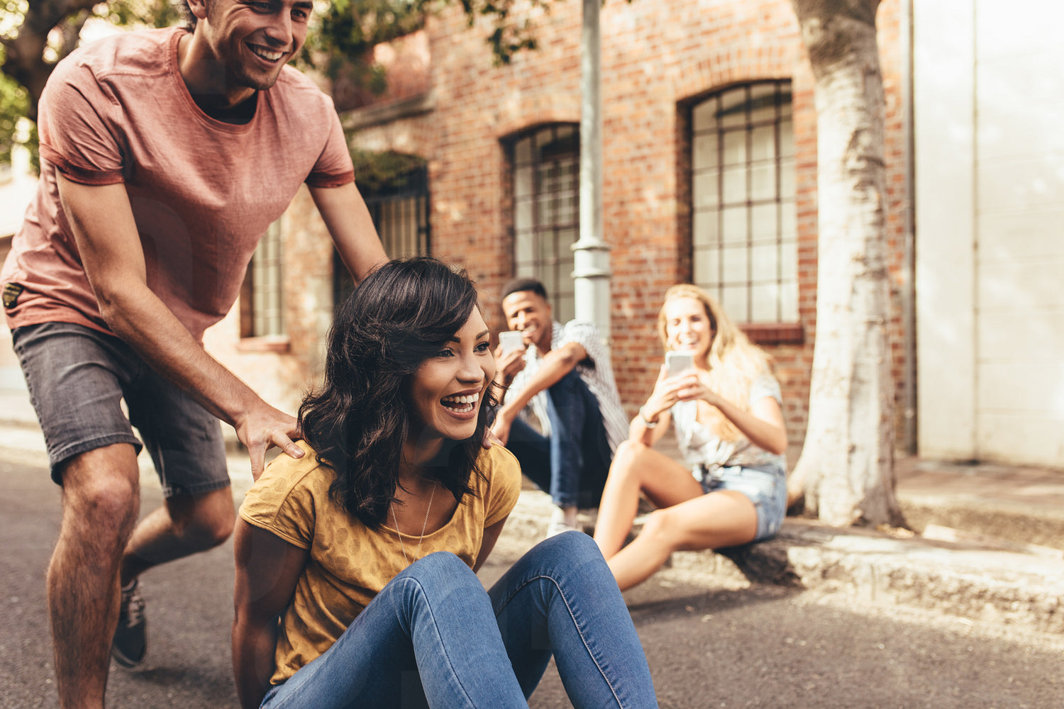 Cheerful woman sitting on skateboard being pushed by a friend outdoors in city street. Friends taking pictures of couple enjoying with skateboard outdoors.
