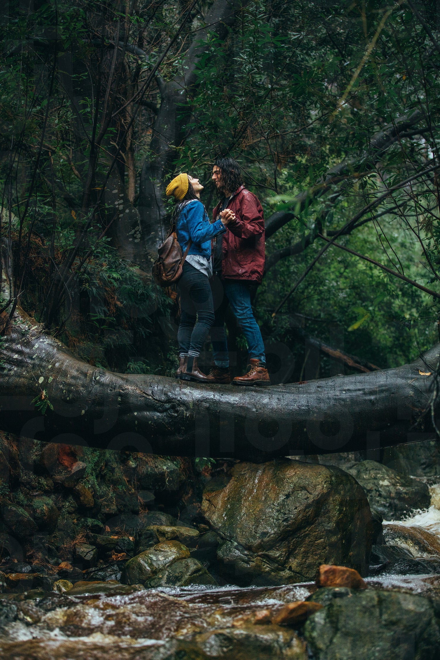 Loving young couple standing together on a log facing each other in the rain at forest. Couple enjoying in rain at the forest.