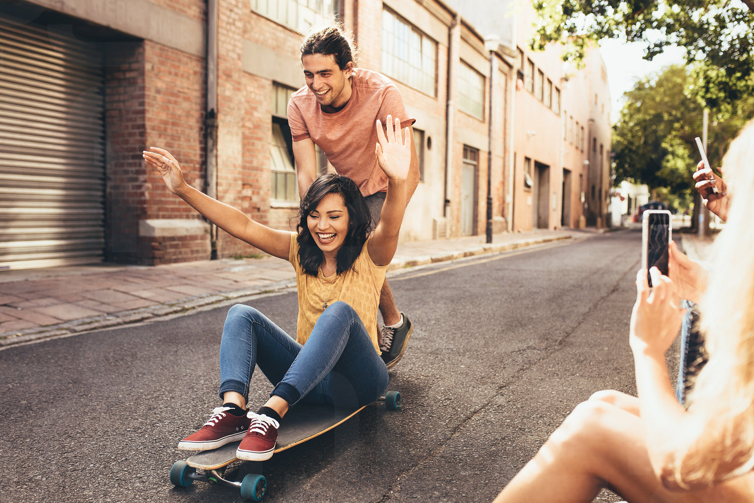 Couple having fun on skateboard with friends taking their pictures. Man pushing woman on skateboard with their friends sitting by the road taking their pictures with mobile phone.