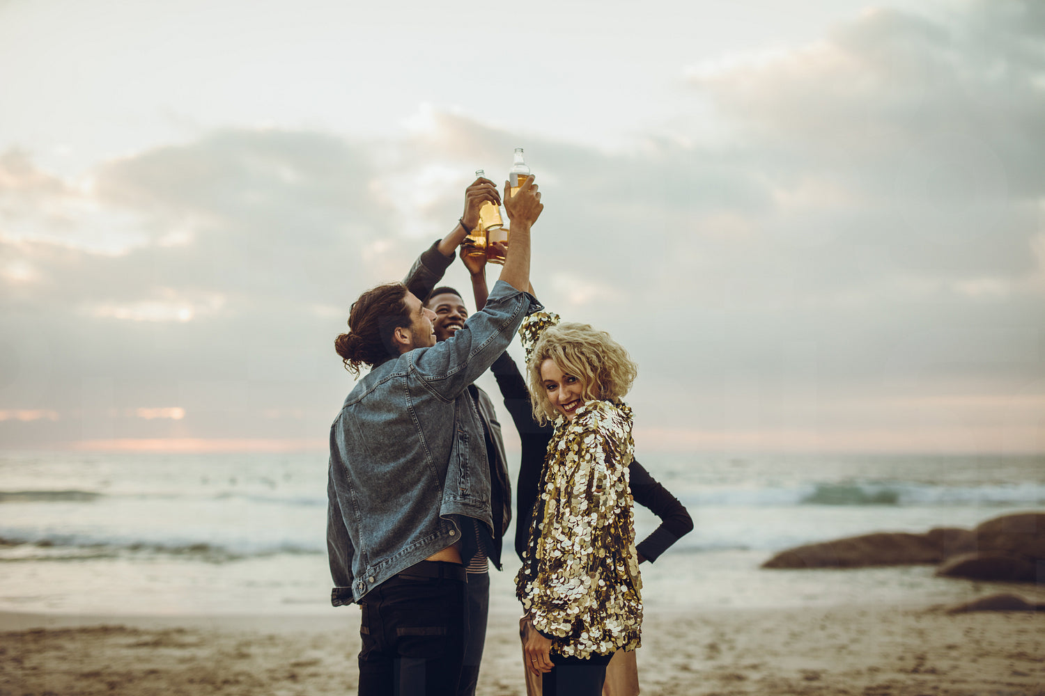 Friends celebrating with beers at the beach