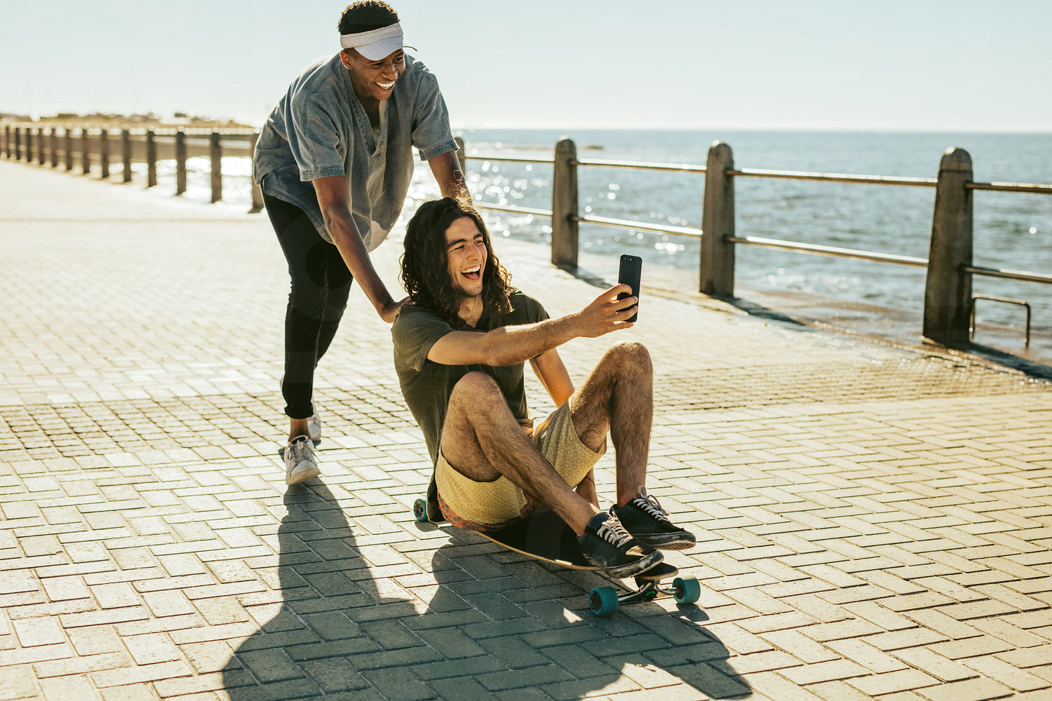 Cheerful friends playing on the skateboard outdoor and taking a selfie. Young guy taking selfie while sitting on skateboard with a friend pushing him.