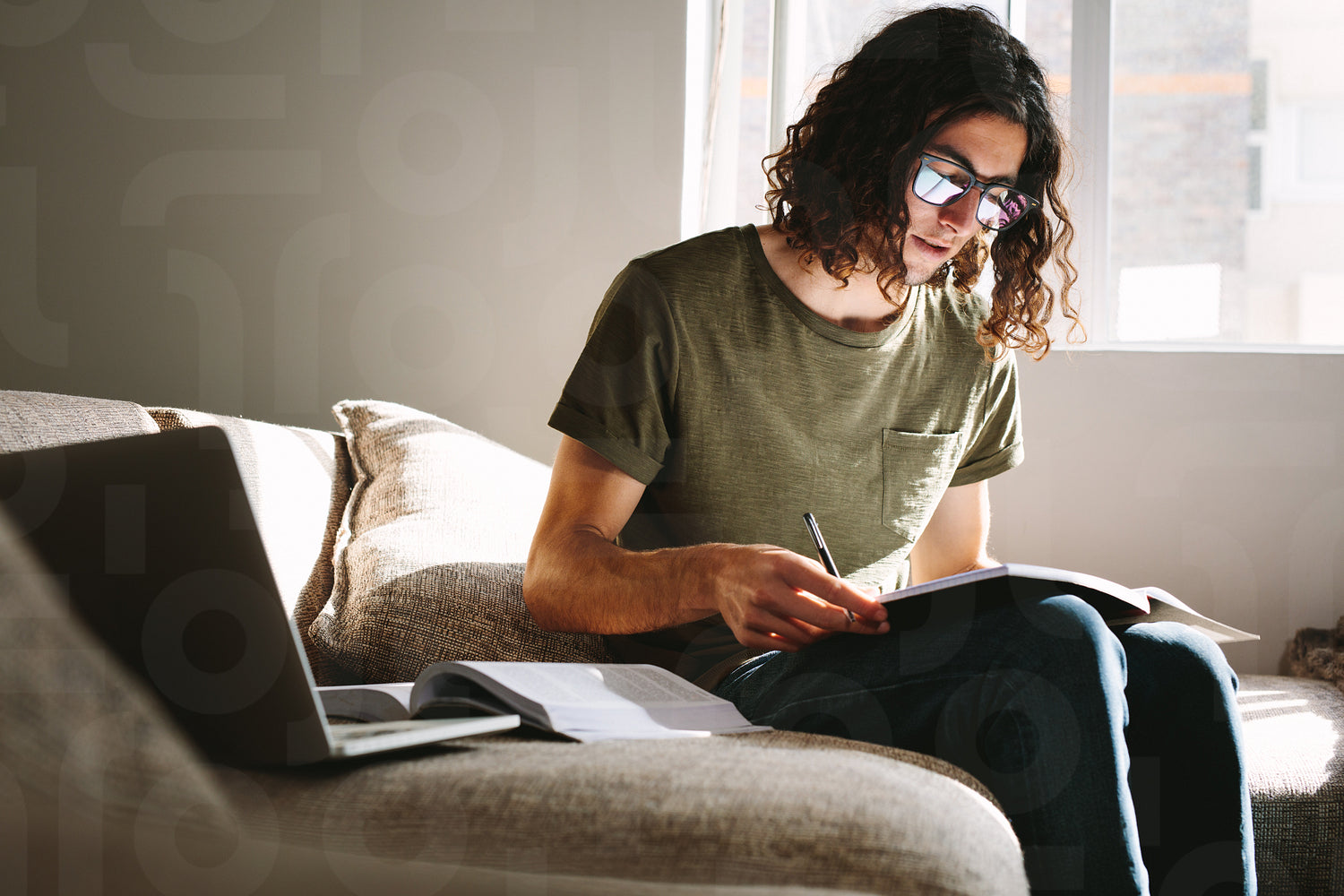 Student studying at home with books and laptop sitting on couch. Man preparing for college exams.