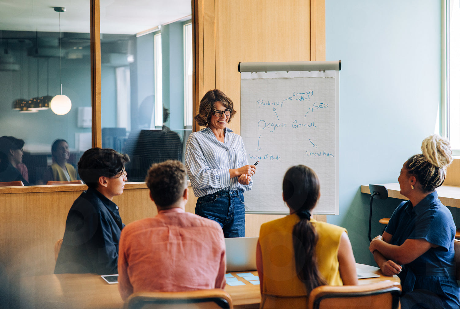 Team gathering in a professional office space focused on achieving marketing and growth goals.