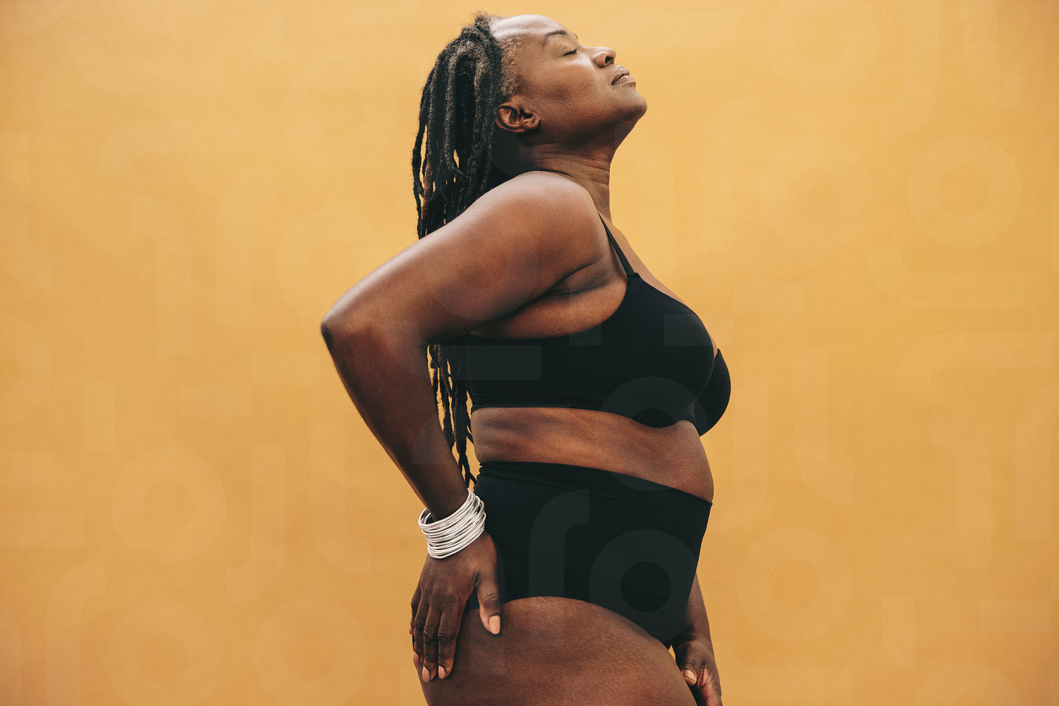 Body positivity and maturity. Self-confident black woman standing against a studio background in black underwear. Mature woman with dreadlocks embracing her natural and ageing body.