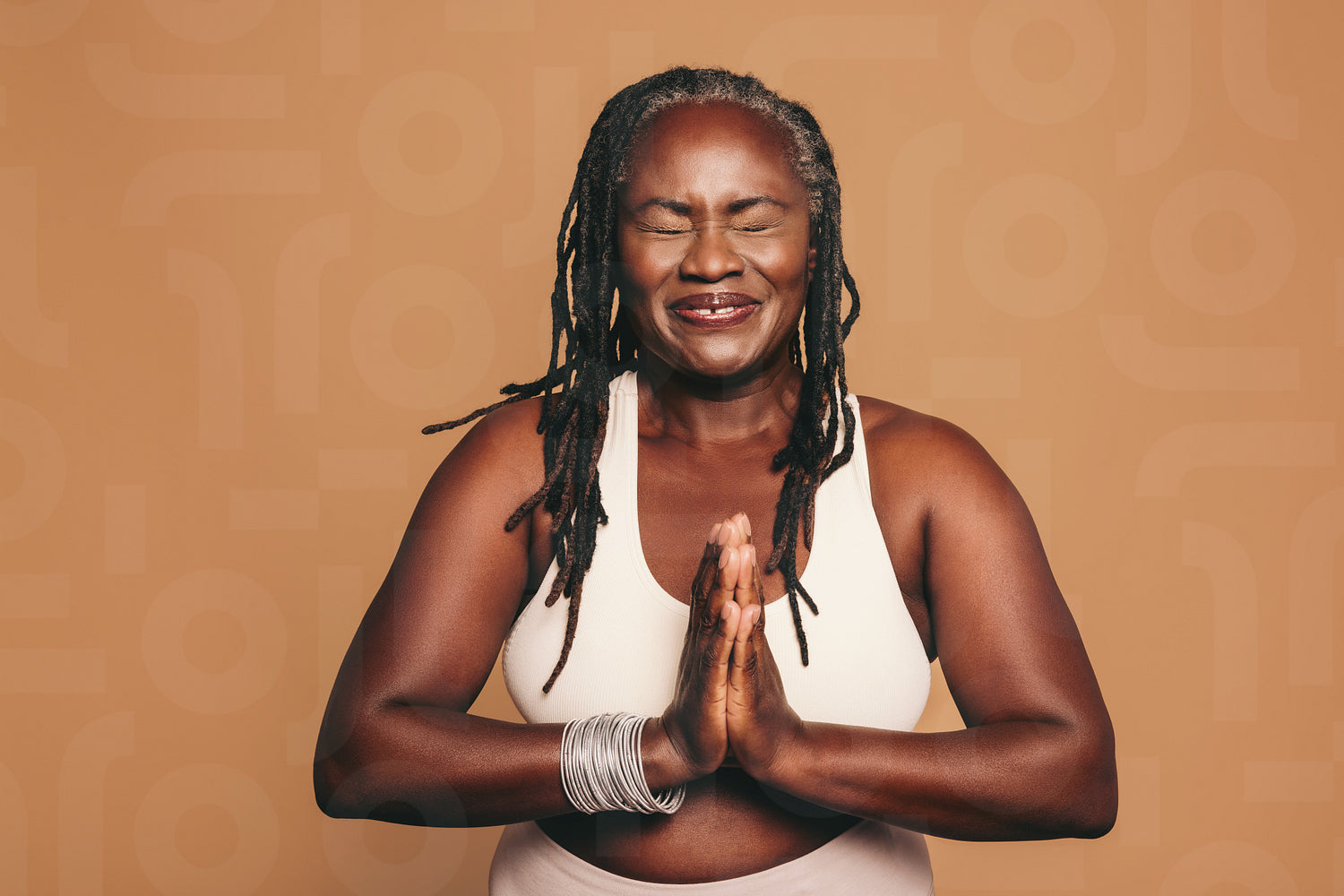 Cheerful woman meditating with her eyes closed and her hands in prayer position. Happy woman with dreadlocks practicing yoga in a studio. Sporty mature woman maintaining a healthy lifestyle.