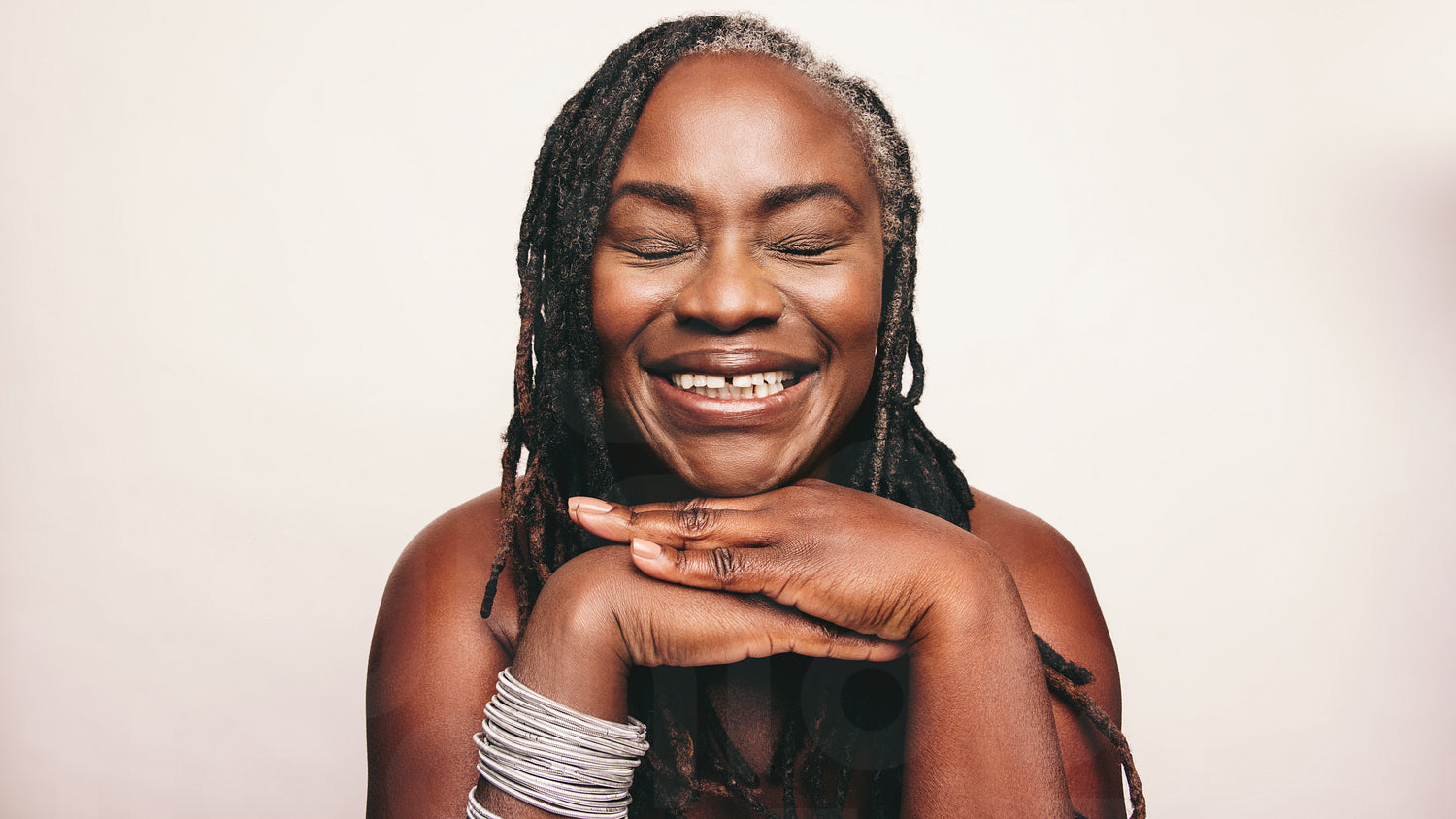 Woman with dreadlocks smiling with her eyes closed against a studio background. Happy mature woman wearing light make-up and jewellery. Cheerful middle-aged woman embracing her ageing body.