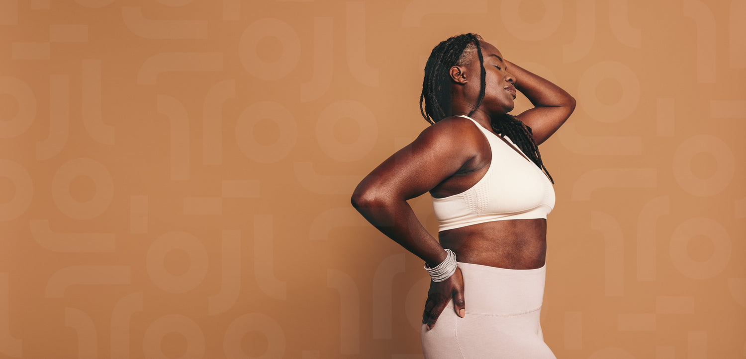 Sporty woman standing against a brown background with her eyes closed. Mature woman with dreadlocks wearing sports clothing in a studio. Athletic black woman maintaining a healthy lifestyle.