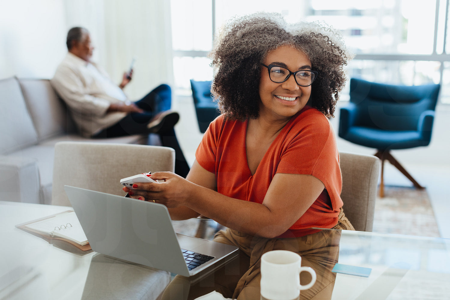 Confident senior woman working from home using her laptop and phone. She is smiling and sitting at a desk in a bright, comfortable living room.