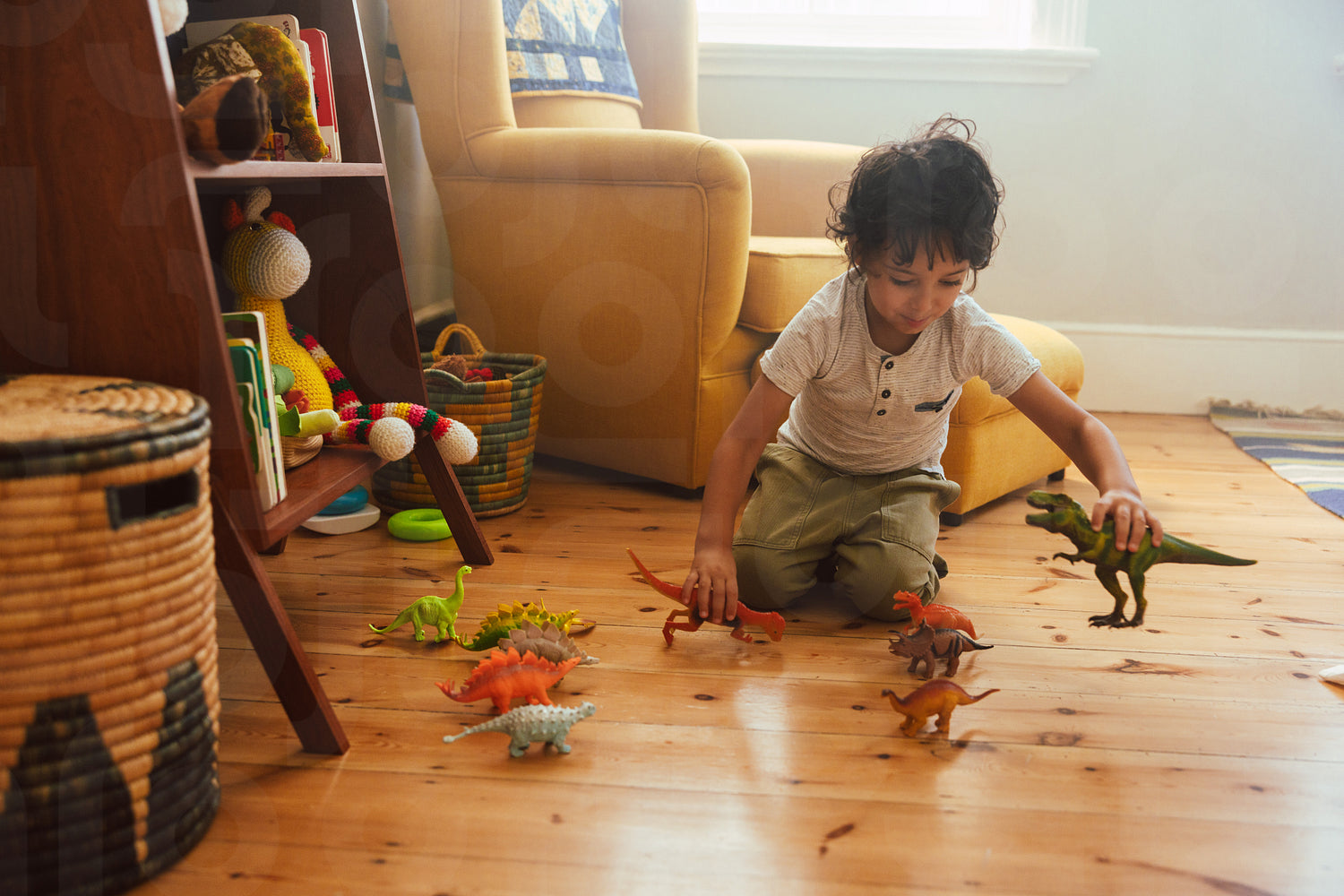 Imaginative young boy playing with colourful dinosaur toys in his play area at home. Adorable little boy kneeling on the floor while playing a fight game with animal toys.
