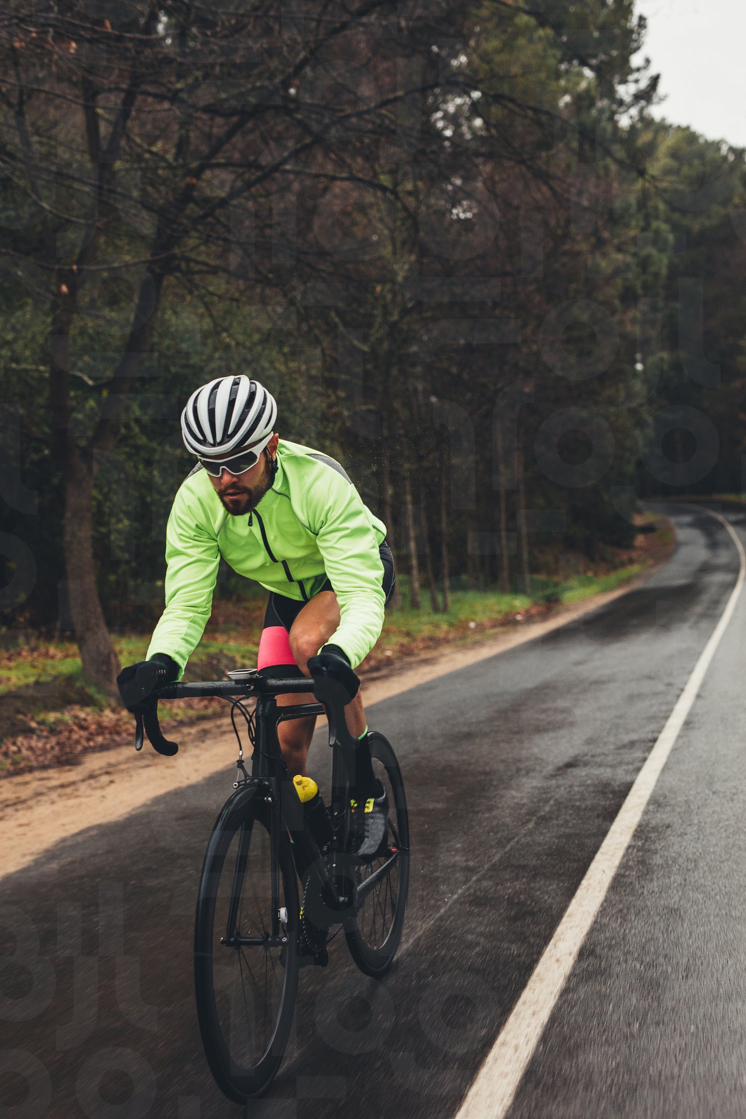 Sportsman riding bicycle on country highway. Professional cyclist practising on a rainy day.