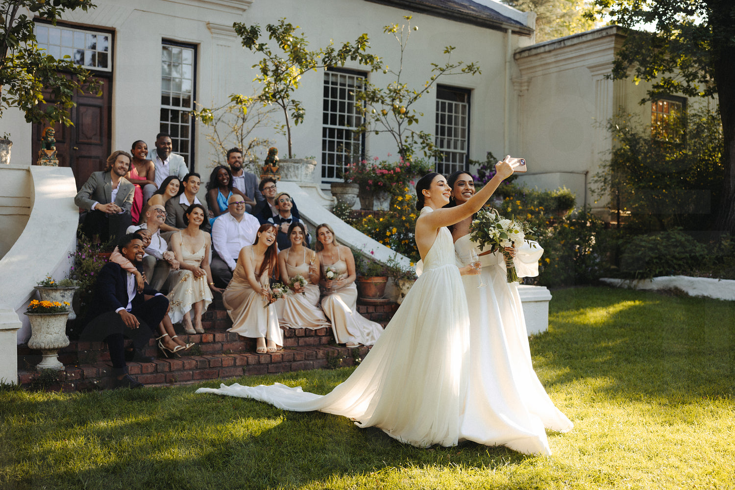 A joyful wedding scene featuring two brides capturing a selfie moment with their wedding party. Everyone is elegantly dressed, and the mood is celebratory.