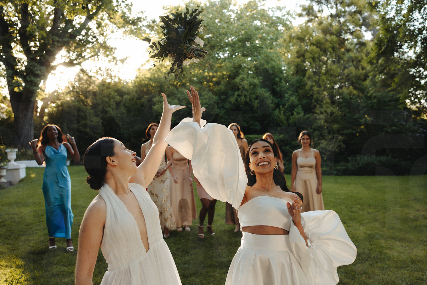 Two brides toss a bouquet in a lush garden wedding setting. Captures joyful moments during a beautiful outdoor celebration filled with laughter, nature, and the happiness of the special occasion.