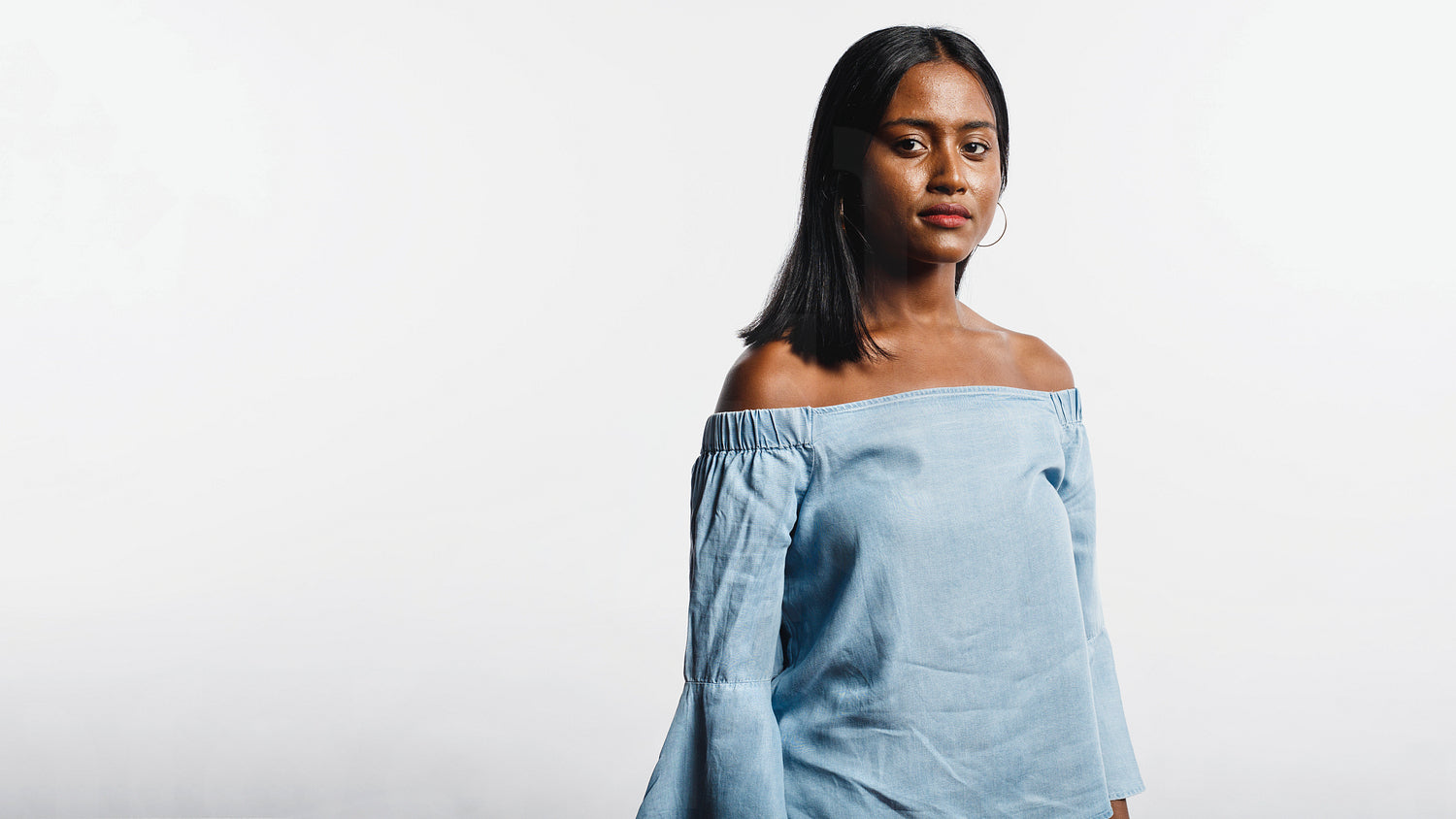 Young woman in fashionable jeans top isolated on white background. Portrait of a woman with a dark complexion.