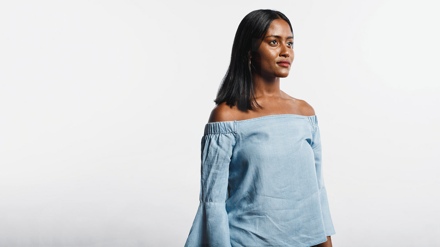 Woman in jeans top isolated on white background. Portrait of woman looking away.