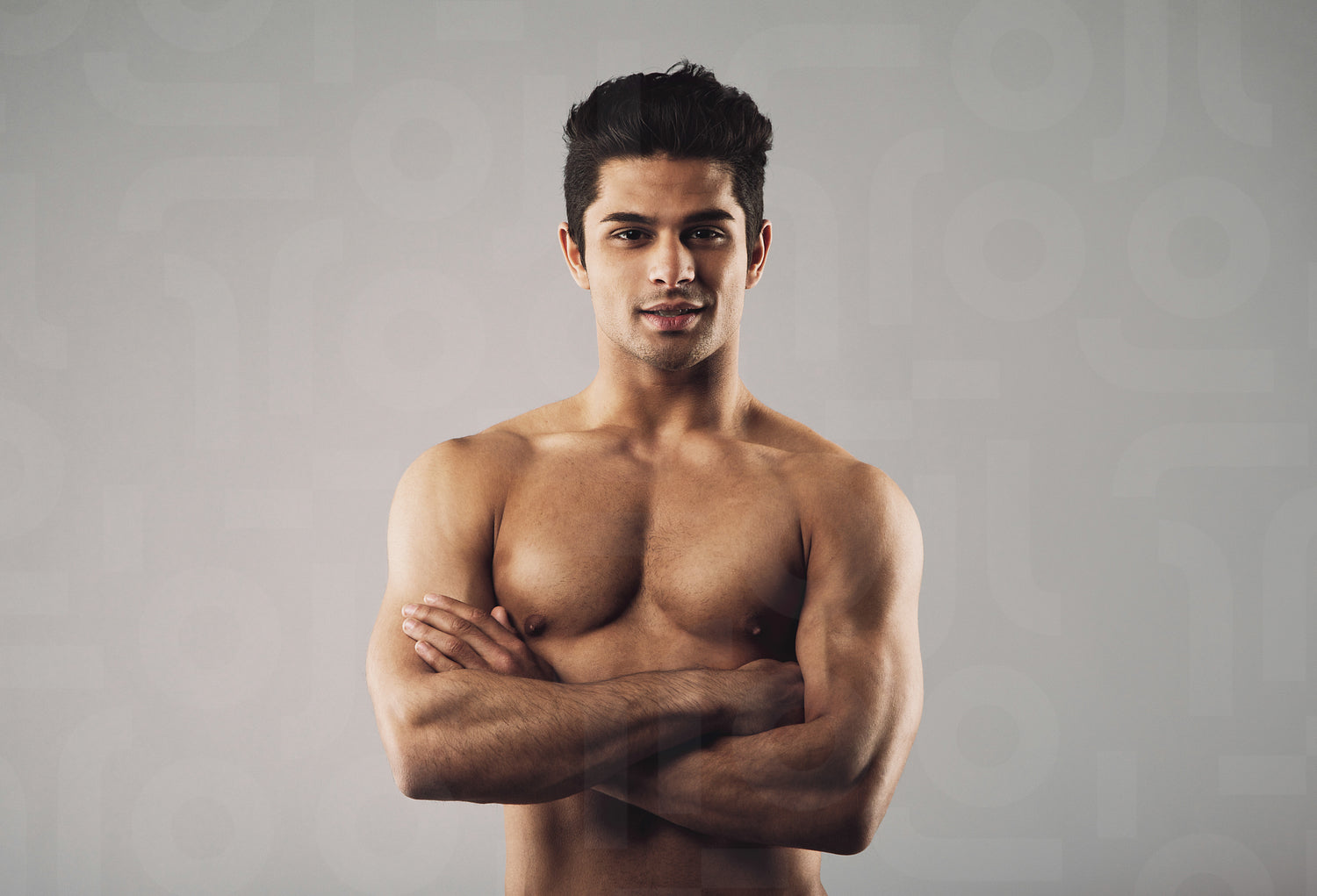 Portrait of a bare-chested muscular man standing with his arms crossed. Fit and masculine young hispanic man shirtless on grey background.